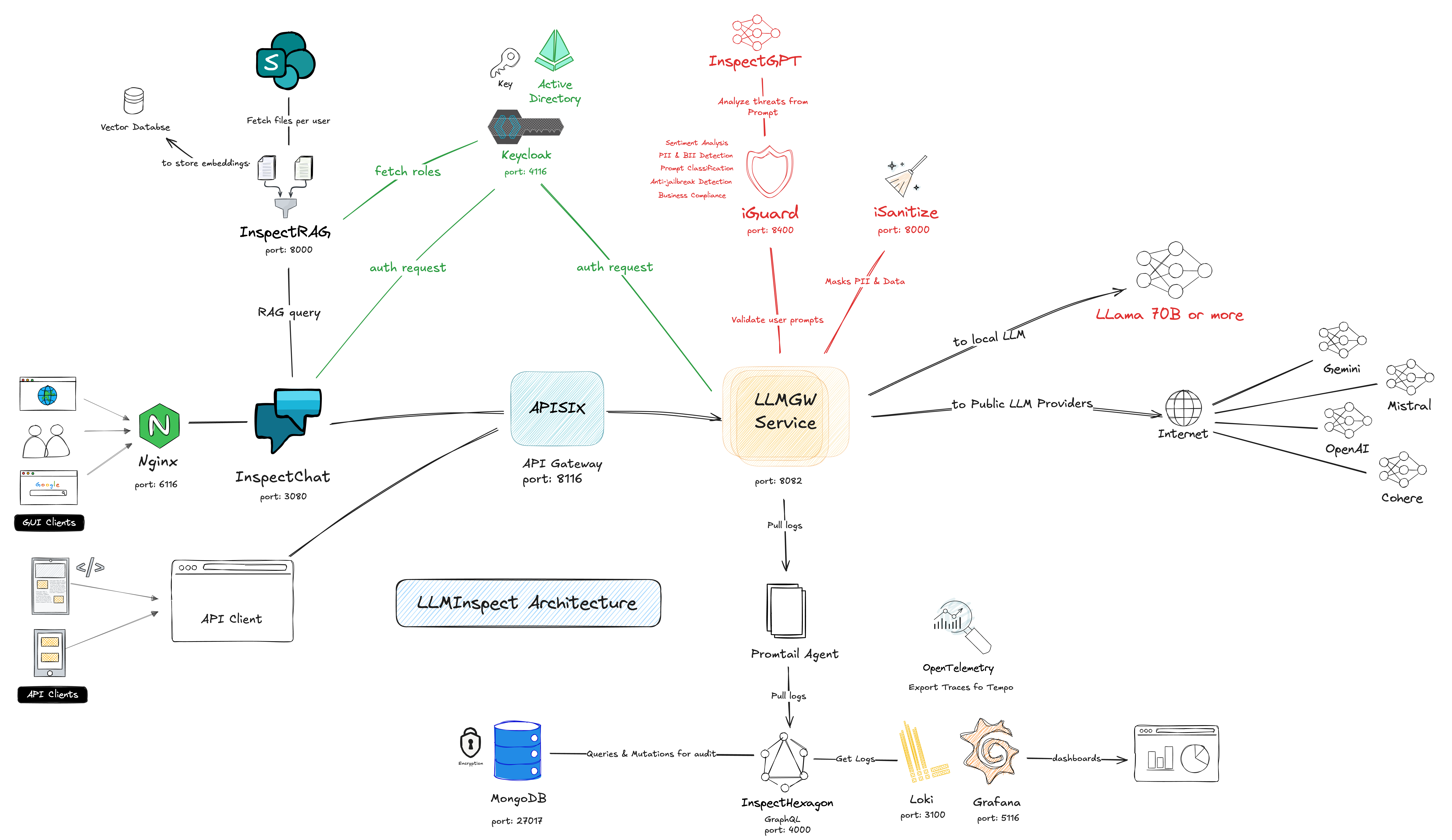 The architecture of LLM-Inspect is designed to offer a robust, secure, and scalable framework that supports both local deployment within enterprise networks and integration with external LLM providers. At the core of the architecture is the LLMGW Service, which acts as the main gateway for managing and processing interactions with LLMs, whether hosted locally or accessed via public APIs. This service ensures that all requests are validated, monitored, and logged, allowing for complete control over data flow and compliance with security protocols.